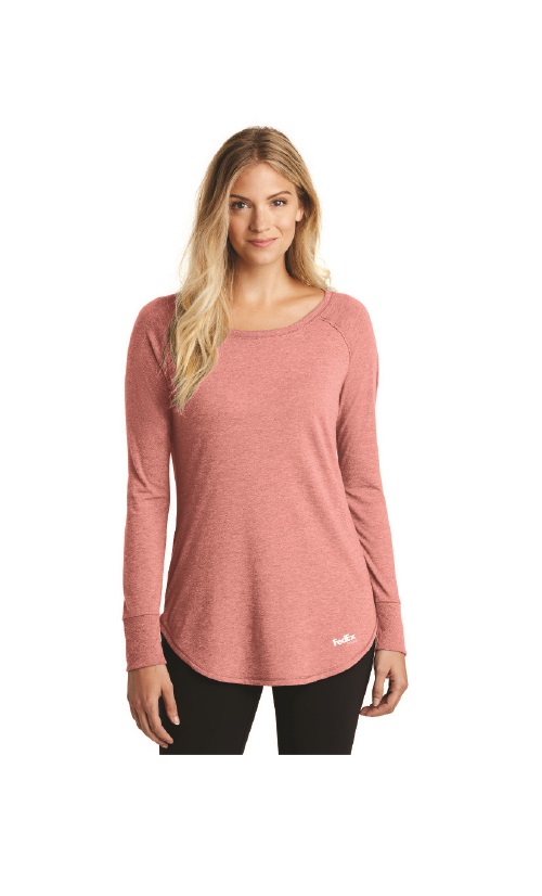This District Made Ladies Perfect Tri-Blend Long Sleeve Tunic Tee is made from a 4.5 ounce Poly/Combed Cotton/Rayon Tri-Blend Fabric. It has raw edge details, coverstitch details, rib knit neck and a beautiful curved hem bottom.