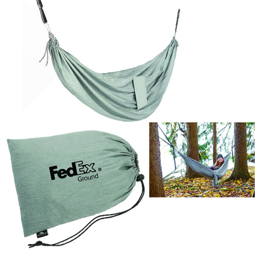 THIS HIGH SIERRA PACKABLE HAMMOCK IS A TWO-PERSON, 500 LB CAPACITY HAMMOCK MADE OF PARACHUTE-GRADE 210T NYLON MATERIAL. ALSO INCLUDED ARE TREE-FRIENDLY, EASY-TO-USE HANGING STRAPS THAT DON'T REQUIRE THE USER TO TIE A KNOW AND HAVE FIVE ADJUSTABLE HANGING POSITIONS USING LOOPS AND STEEL CARABINERS. HAMMOCK OPENS TO 55" X 105" BUT FOLDS DOWN INTO HANDY CARRY/STORAGE BAG WITH THE "FEDEX GROUND" LOGO ON IT.